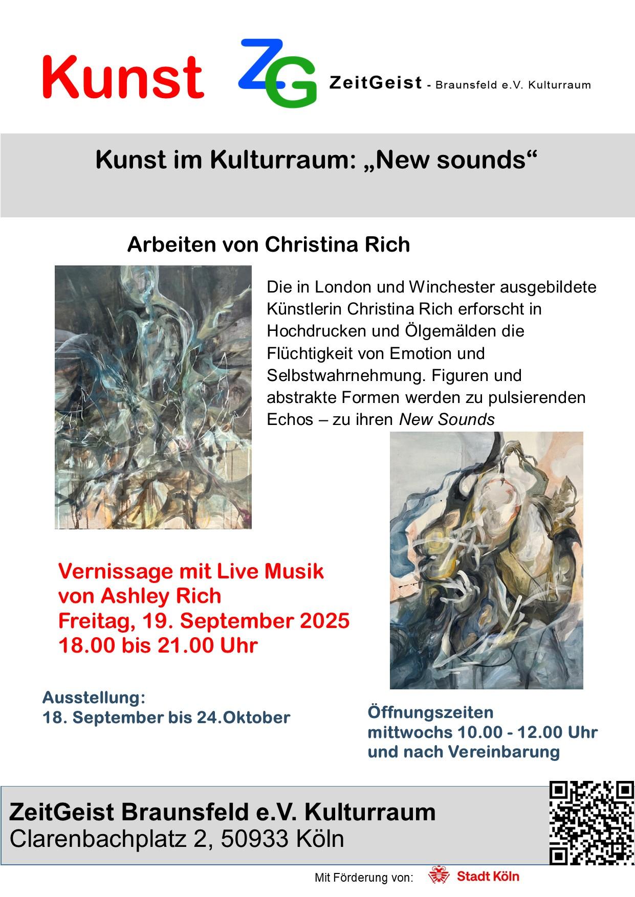 Die in London und Winchester ausgebildete Künstlerin Christina Rich erforscht in Hochdrucken und Ölgemälden die Flüchtigkeit von Emotion und Selbstwahrnehmung. Figuren und abstrakte Formen werden zu pulsierenden Echos – zu ihren New Sounds